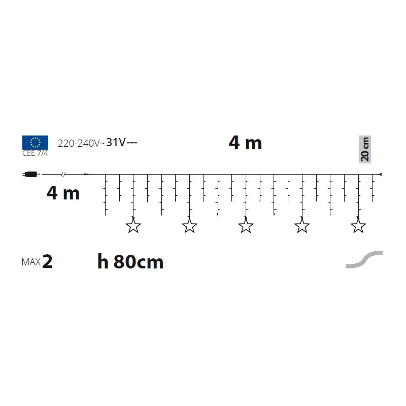 ### **Ice Light Stelle 150 LED – 400x80 cm, Bianco Caldo** Crea un’atmosfera incantata con la **Ice Light Stelle**, trasformando qualsiasi spazio in un cielo stellato caldo e accogliente. --- ### **Caratteristiche principali:** * **Design Stellare:** * 5 stelle luminose, ciascuna con LED Ø5mm Reflex di alta qualità * Luce **bianco caldo** avvolgente * **Illuminazione Personalizzabile:** * **Memory Controller** con 8 giochi di luce * **Timer integrato:** 8 ore On, 16 ore Off * Controllo semplice tramite **pulsante luminoso** * **Flessibilità e Prolungabilità:** * Collegabile fino a 2 pezzi per un totale di **8 metri e 300 LED** * **Connessione Smart:** * Compatibile con il sistema **31V Smart Connect** * **Sicurezza:** * Trasformatore a bassa tensione incluso * Certificazione **IP44**, adatta per uso interno ed esterno * **Dimensioni:** * Lunghezza: 400 cm * Altezza: 80 cm * Cavo di alimentazione trasparente da 4 metri * **Confezione di Lusso:** * Scatola colorata XKC Art. SC ILS 150-PC 4M, perfetta come regalo --- ### **Perché sceglierla:** * Trasforma ogni ambiente in un cielo stellato magico * Illuminazione calda e accogliente, ideale per feste o decorazioni natalizie * Facilmente prolungabile per creare scenografie più grandi * Sicura e versatile, per interno ed esterno Con la **Ice Light Stelle 150 LED**, sorprendere e stupire con un cielo illuminato non è mai stato così semplice ed elegante.