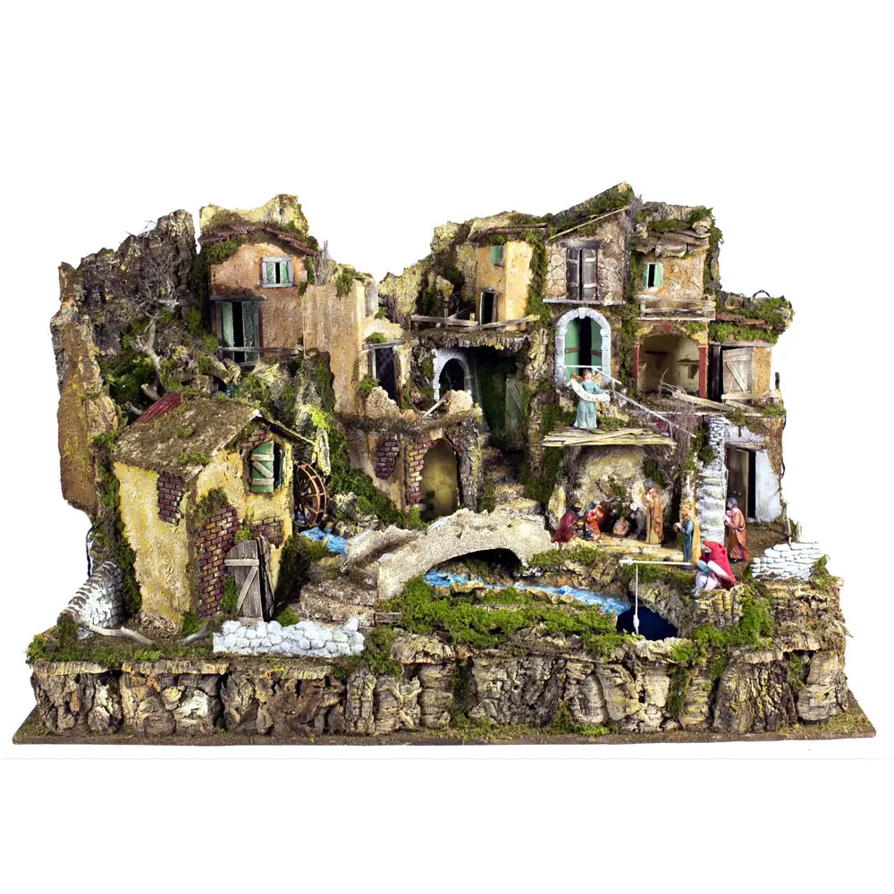 Borgo Presepe con Luci Natività Pescatore e Cascata in Movimento